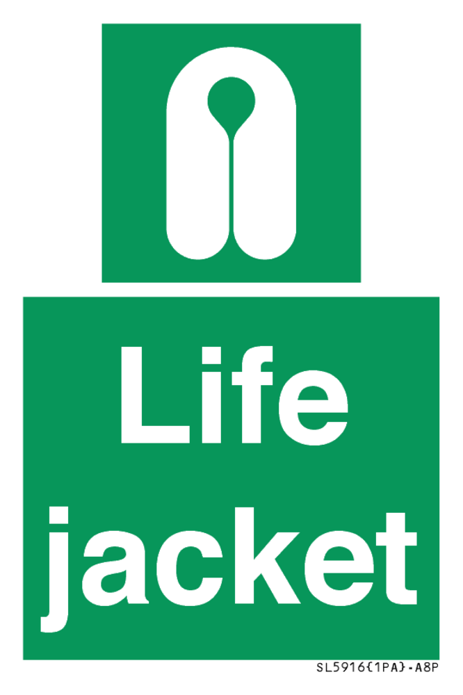 Sign Text: Life jacket Dimensions: 50x75mm Material: Plastic semi rigid 1mm self adhesive Orientation: Portrait Text Colour: White Background Colour: Green More...