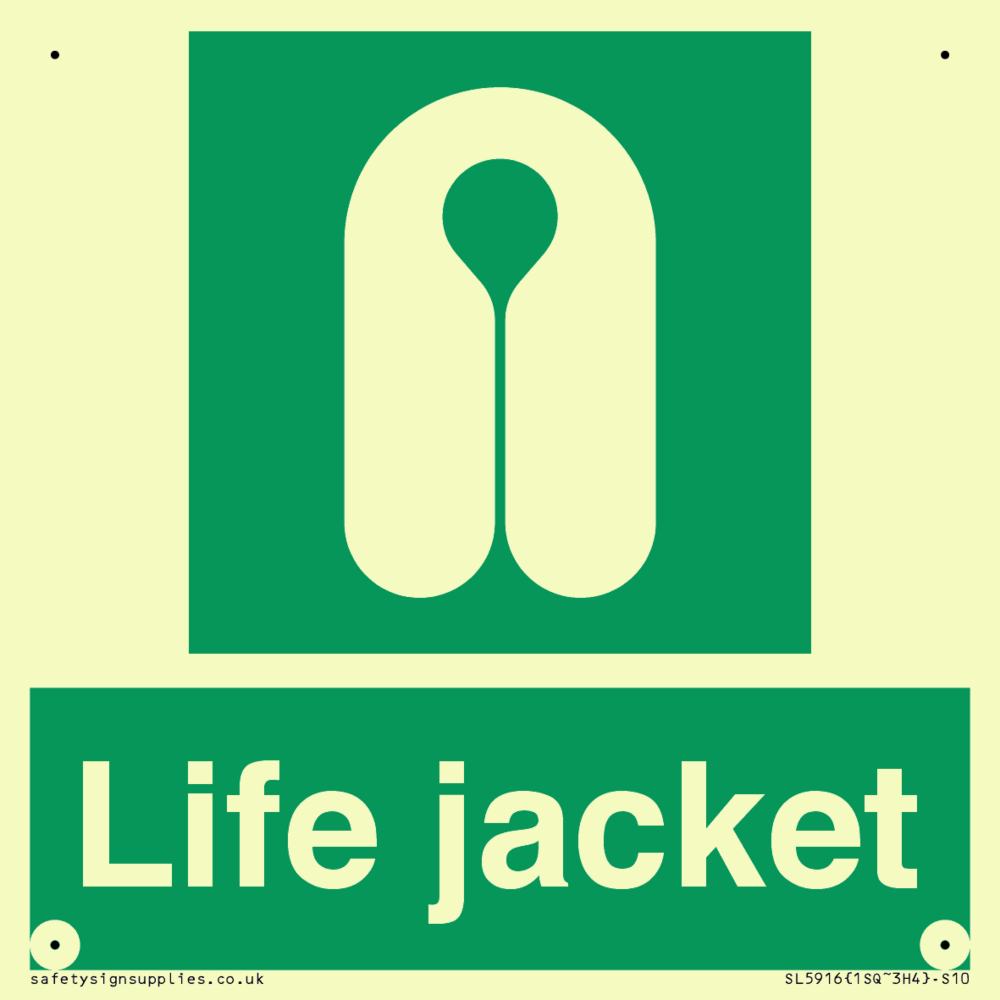 Sign Text: Life jacket Dimensions: 100x100mm Material: Plastic Semi-rigid Photoluminescent Orientation: Square Text Colour: White Background Colour: Green More...