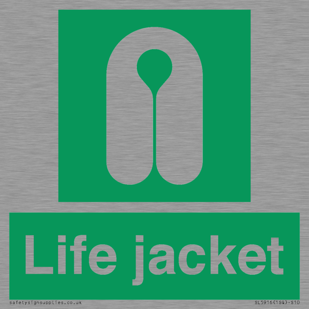 Sign Text: Life jacket Dimensions: 100x100mm Material: Stainless Steel Orientation: Square Text Colour: White Background Colour: Green More...