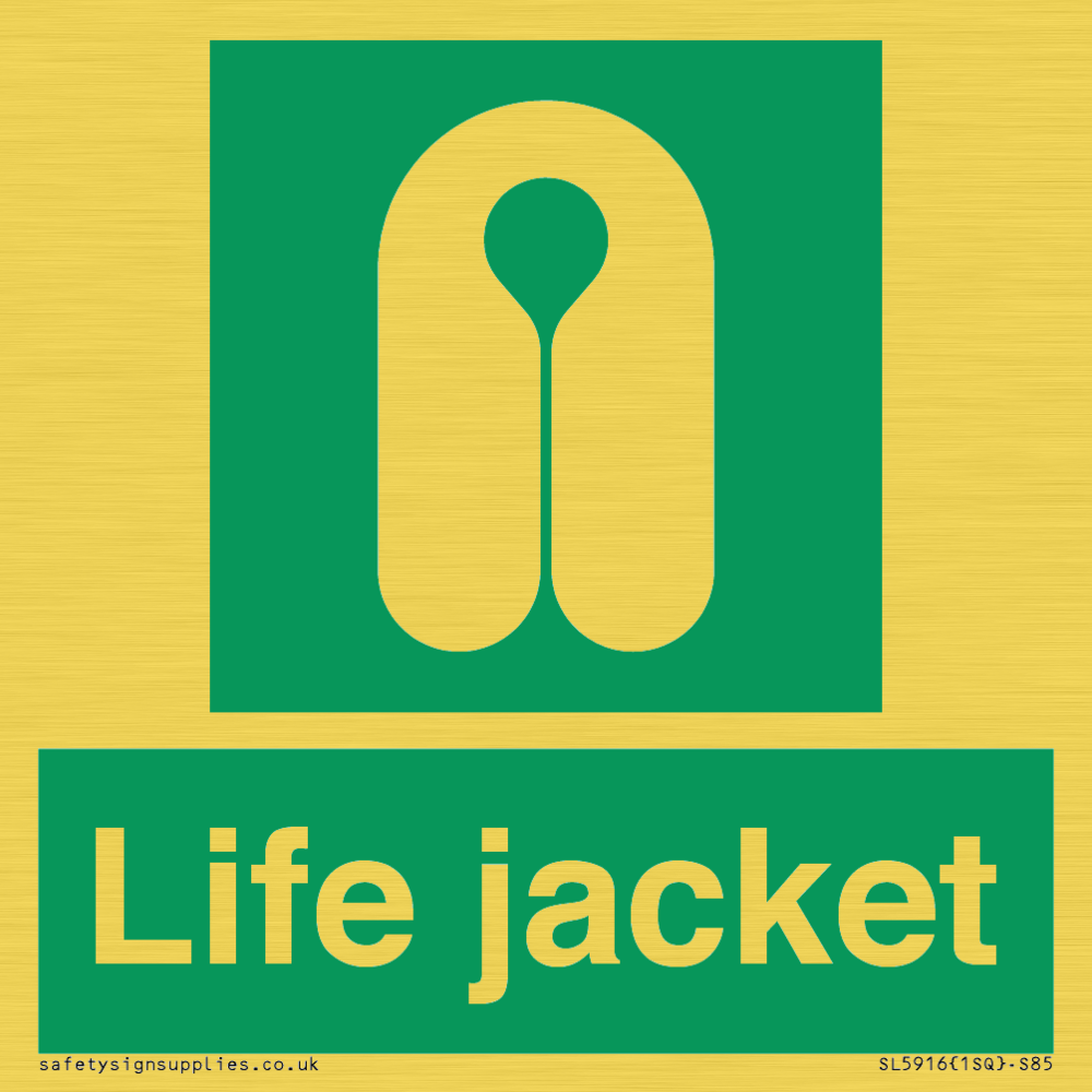 Sign Text: Life jacket Dimensions: 85x85mm Material: Plastic Semi-rigid Gold Orientation: Square Text Colour: White Background Colour: Green More...