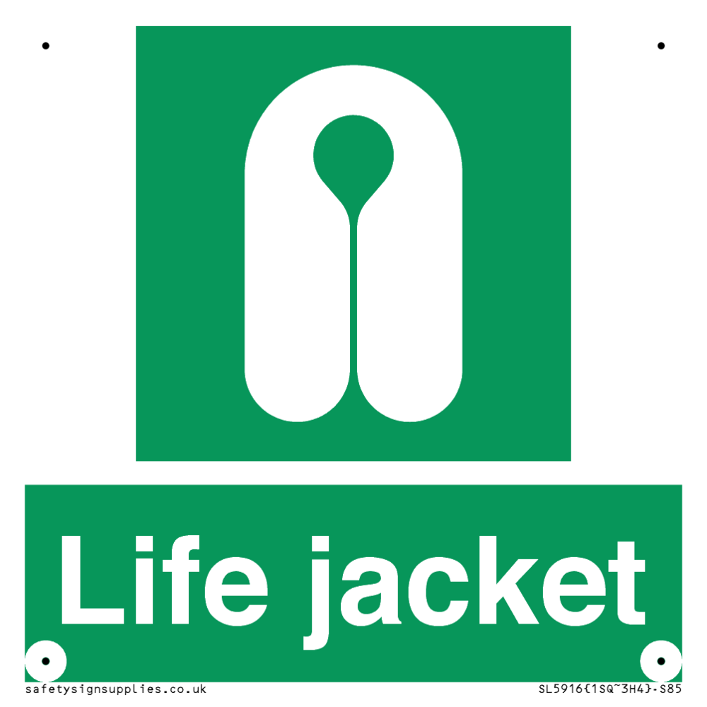 Sign Text: Life jacket Dimensions: 85x85mm Material: Plastic semi rigid 1mm self adhesive Orientation: Square Text Colour: White Background Colour: Green More...