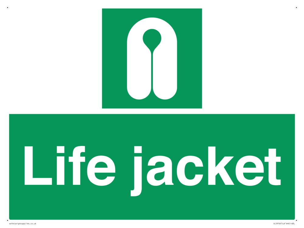 Sign Text: Life jacket Dimensions: 400x300mm Material: Plastic semi rigid 1mm self adhesive Orientation: Landscape Text Colour: White Background Colour: Green More...