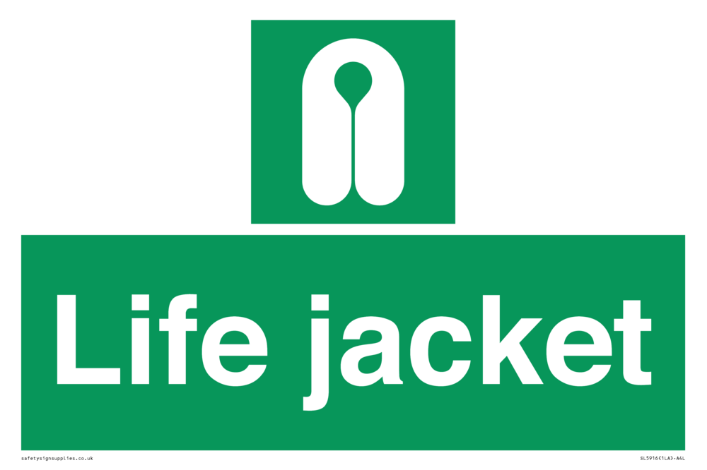 Sign Text: Life jacket Dimensions: 300x200mm Material: Plastic semi rigid 1mm self adhesive Orientation: Landscape Text Colour: White Background Colour: Green More...