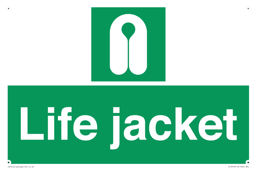 Sign Text: Life jacket Dimensions: 300x200mm Material: Plastic Rigid 3mm Orientation: Landscape Text Colour: White Background Colour: Green More...