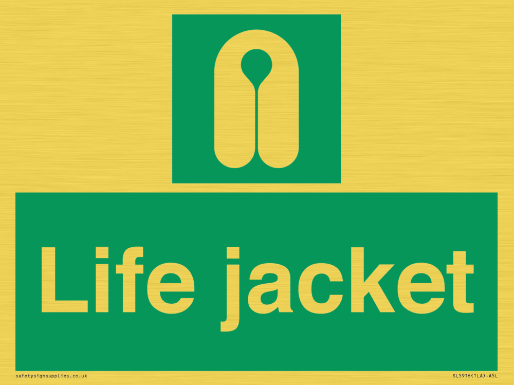 Sign Text: Life jacket Dimensions: 200x150mm Material: Plastic Semi-rigid Gold Orientation: Landscape Text Colour: White Background Colour: Green More...