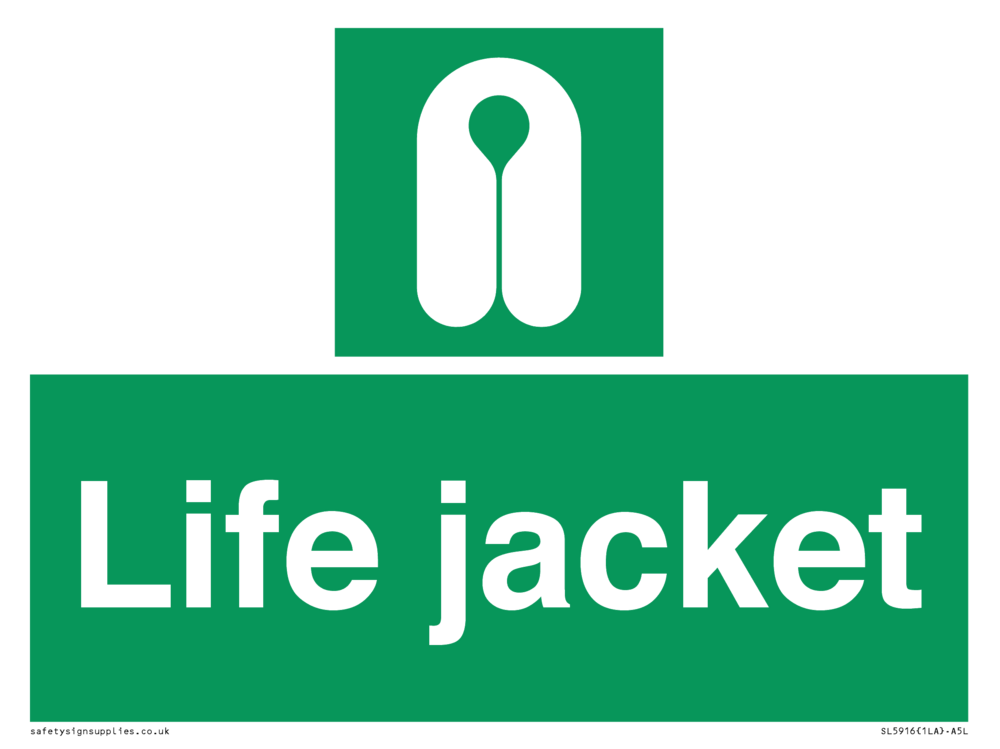 Sign Text: Life jacket Dimensions: 200x150mm Material: Vinyl / Sticker Orientation: Landscape Text Colour: White Background Colour: Green More...