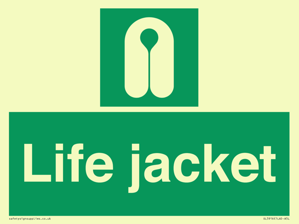Sign Text: Life jacket Dimensions: 200x150mm Material: Plastic Semi-rigid Photoluminescent Orientation: Landscape Text Colour: White Background Colour: Green More...