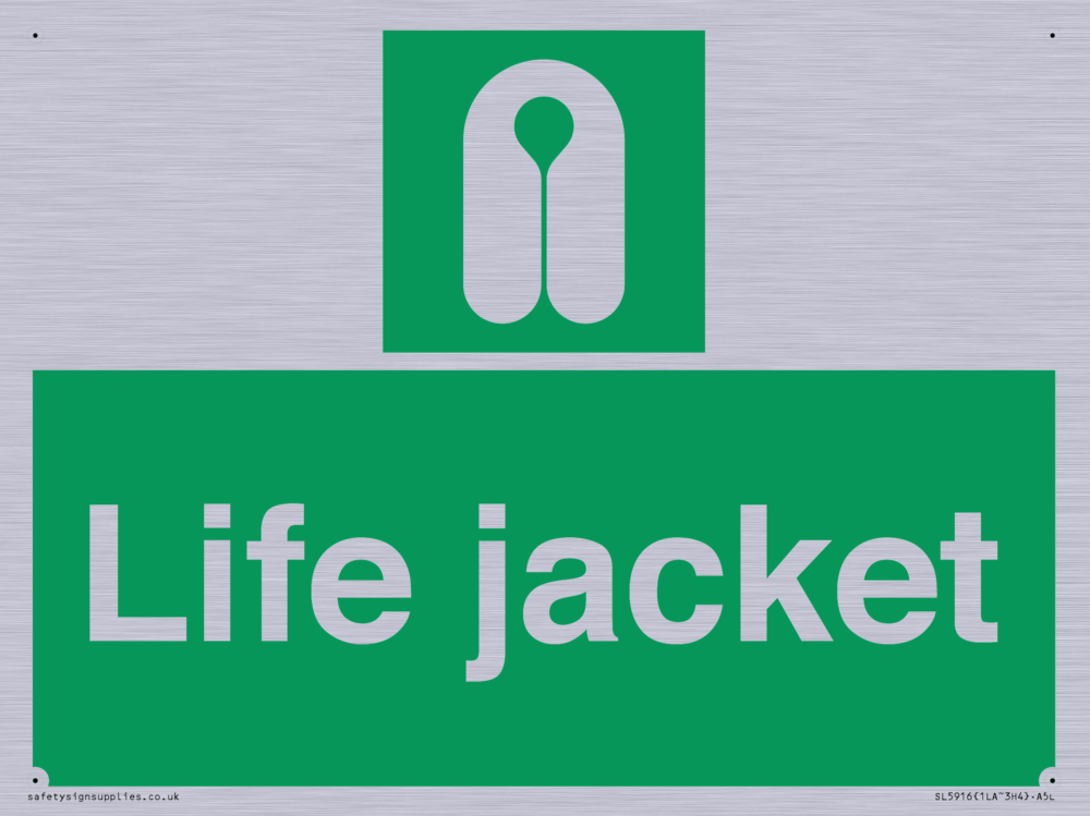 Sign Text: Life jacket Dimensions: 200x150mm Material: Grained Silver Aluminium Orientation: Landscape Text Colour: White Background Colour: Green More...