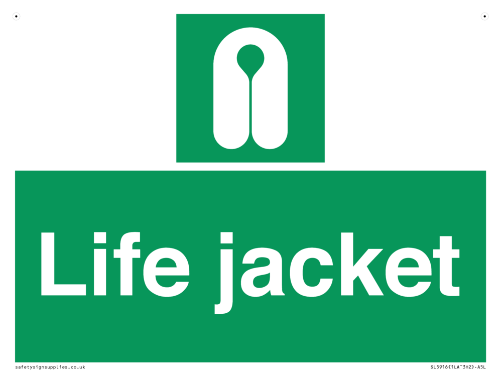 Sign Text: Life jacket Dimensions: 200x150mm Material: Plastic Rigid 3mm Orientation: Landscape Text Colour: White Background Colour: Green More...