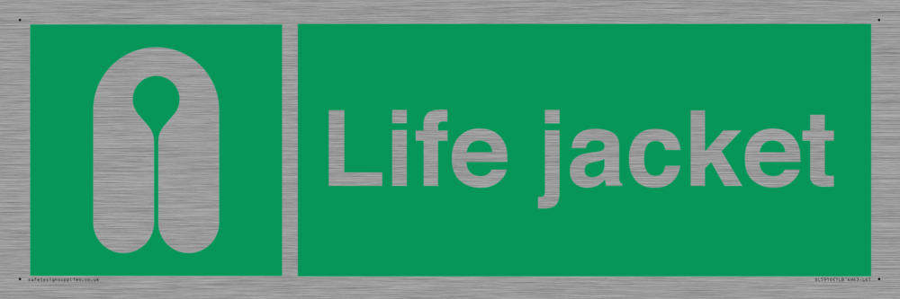 Sign Text: Life jacket Dimensions: 450x150mm Material: Stainless Steel Text Colour: White Background Colour: Green Recommended Fixings: Comes with Self Adhesive More...