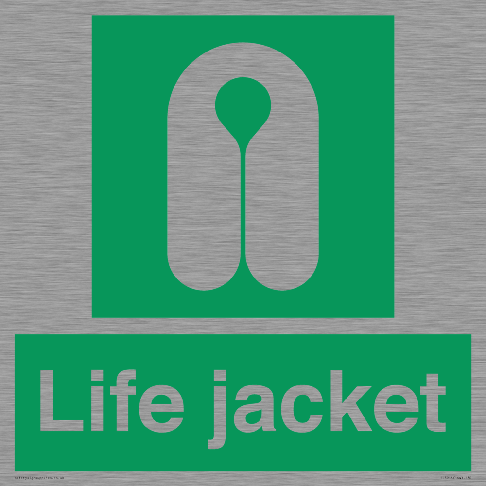 Sign Text: Life jacket Dimensions: 300x300mm Material: Stainless Steel Orientation: Square Text Colour: White Background Colour: Green More...