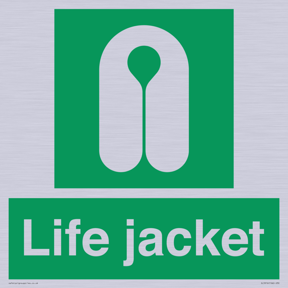 Sign Text: Life jacket Dimensions: 300x300mm Material: Plastic Semi-rigid Silver Orientation: Square Text Colour: White Background Colour: Green More...