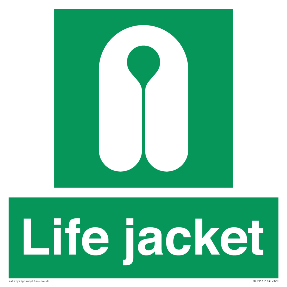 Sign Text: Life jacket Dimensions: 200x200mm Material: Aluminium composite 3mm with lamination Orientation: Square Text Colour: White Background Colour: Green More...