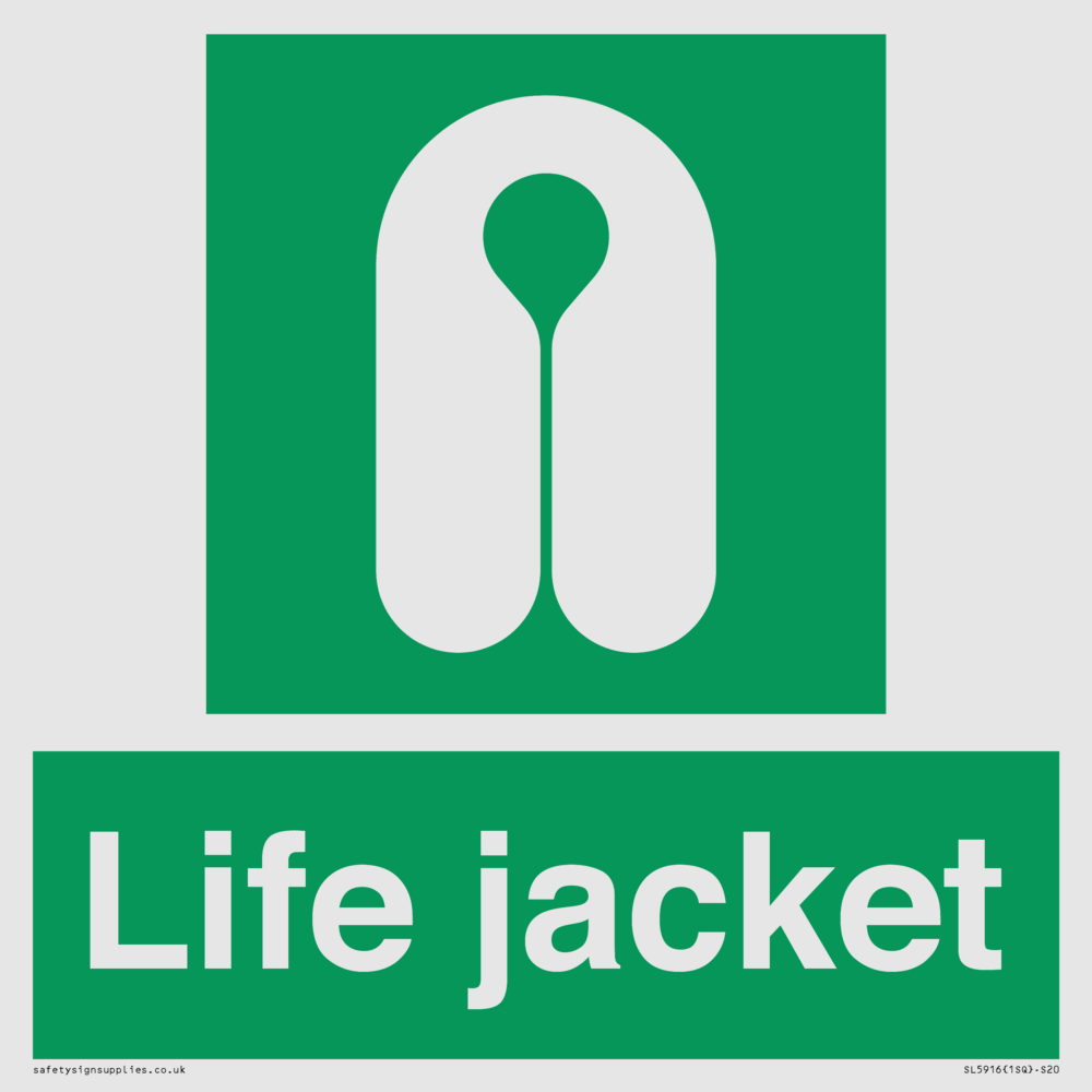 Sign Text: Life jacket Dimensions: 200x200mm Material: White Reflective Aluminium Composite 3mm Orientation: Square Text Colour: White Background Colour: Green More...