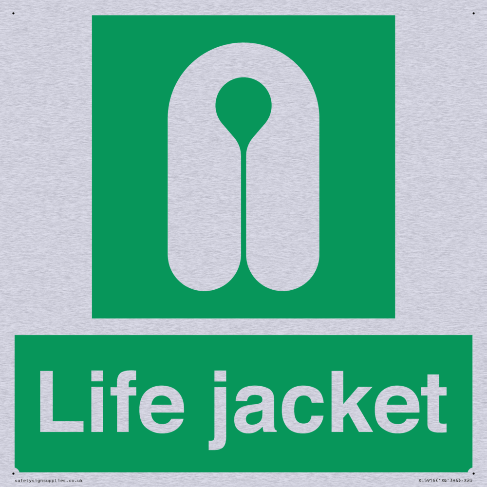 Sign Text: Life jacket Dimensions: 200x200mm Material: Satin Silver Aluminium Orientation: Square Text Colour: White Background Colour: Green More...