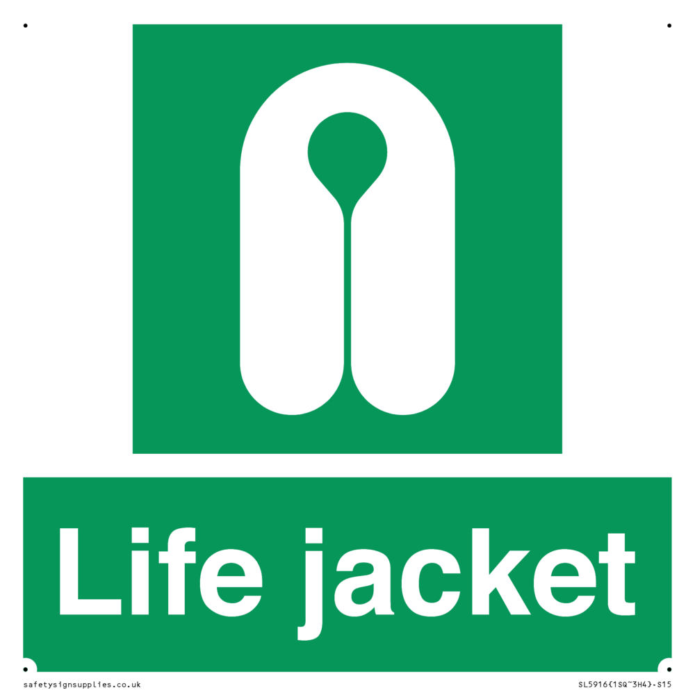 Sign Text: Life jacket Dimensions: 150x150mm Material: Aluminium Composite 3mm Orientation: Square Text Colour: White Background Colour: Green More...