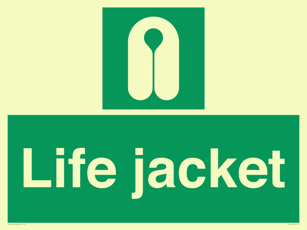 Sign Text: Life jacket Dimensions: 800x600mm Material: Plastic Semi-rigid Photoluminescent Orientation: Landscape Text Colour: White Background Colour: Green More...