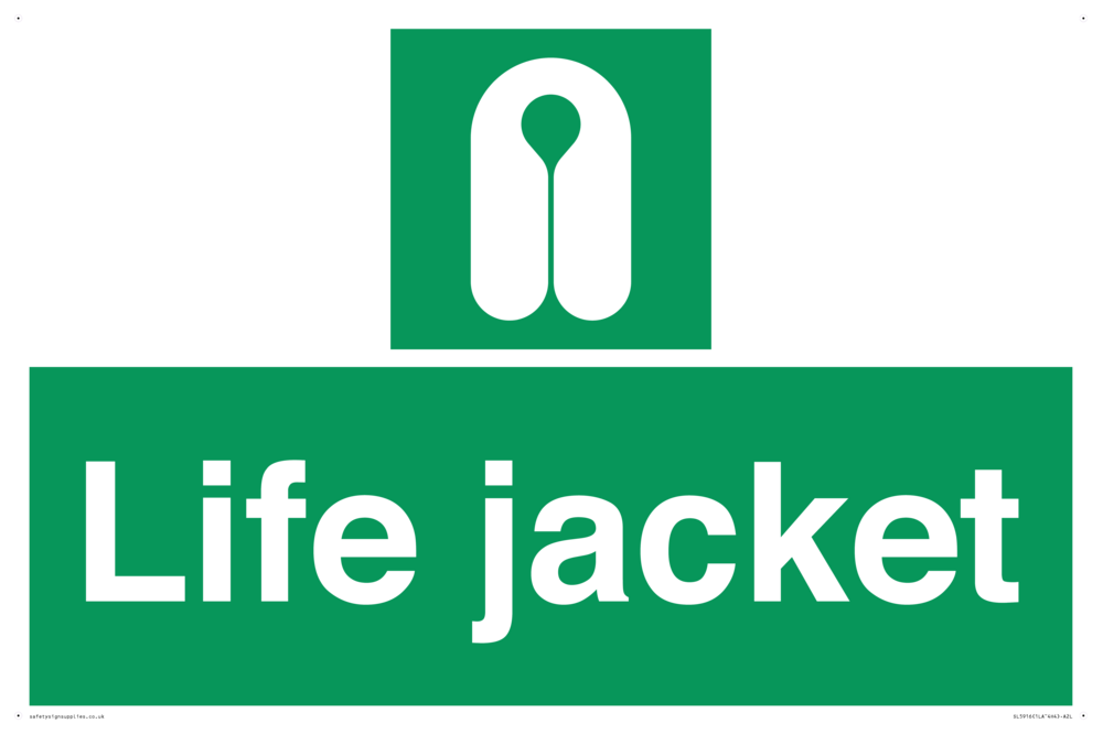 Sign Text: Life jacket Dimensions: 600x400mm Material: Aluminium Composite 3mm Orientation: Landscape Text Colour: White Background Colour: Green More...