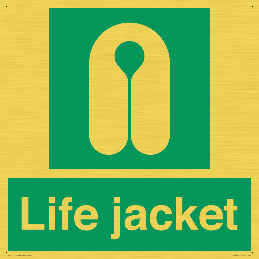 Sign Text: Life jacket Dimensions: 400x400mm Material: Plastic Semi-rigid Gold Orientation: Square Text Colour: White Background Colour: Green More...
