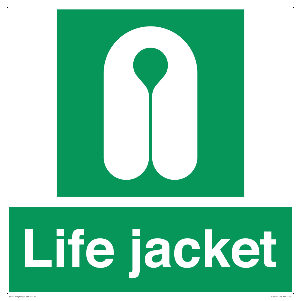 Sign Text: Life jacket Dimensions: 400x400mm Material: Aluminium Composite 3mm Orientation: Square Text Colour: White Background Colour: Green More...