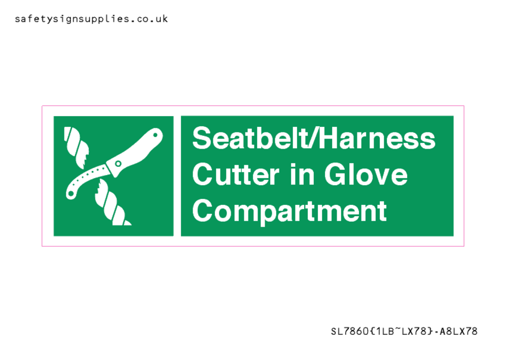 Sign Text: Seatbelt/Harness Cutter in Glove Compartment