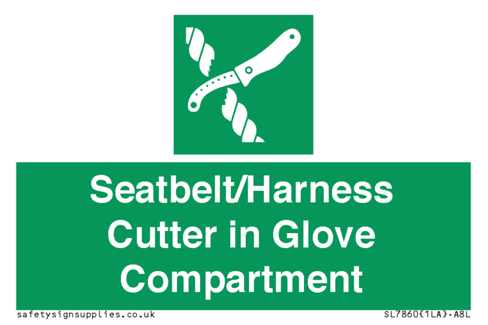 Sign Text: Seatbelt/Harness Cutter in Glove Compartment
