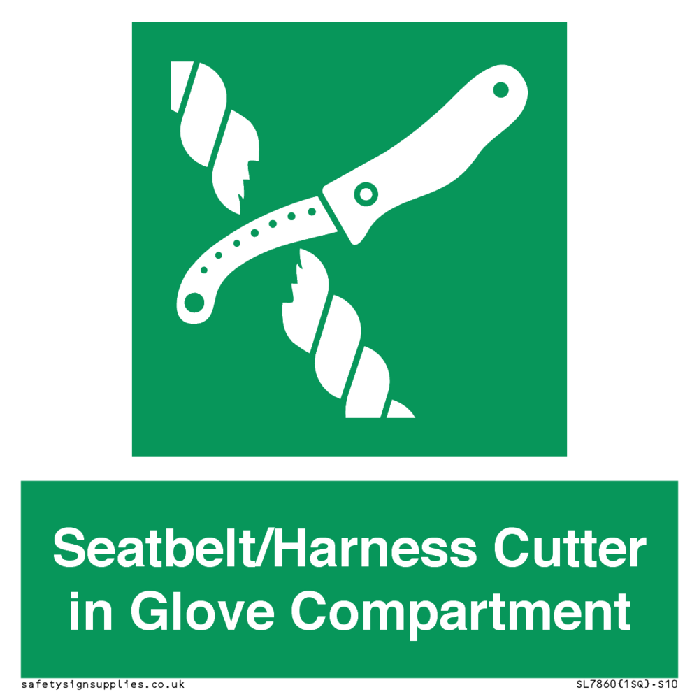 Sign Text: Seatbelt/Harness Cutter in Glove Compartment