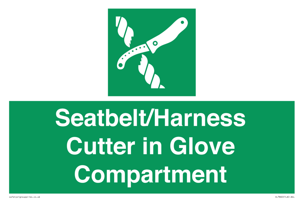 Sign Text: Seatbelt/Harness Cutter in Glove Compartment