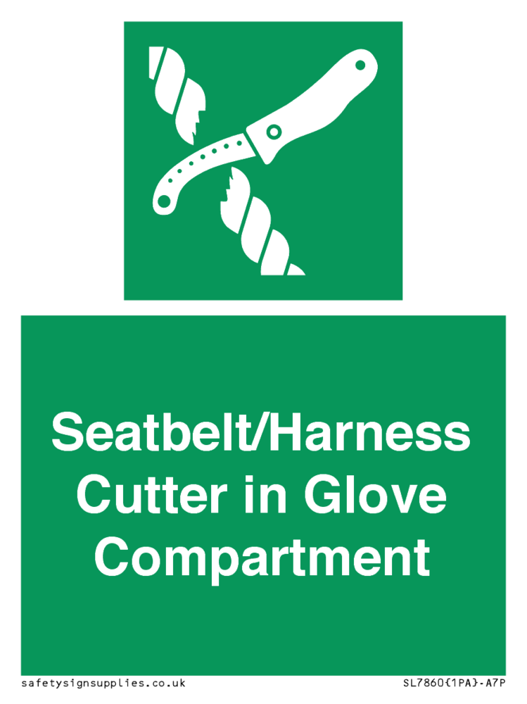 Sign Text: Seatbelt/Harness Cutter in Glove Compartment