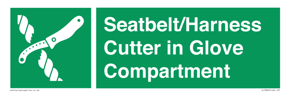 Sign Text: Seatbelt/Harness Cutter in Glove Compartment