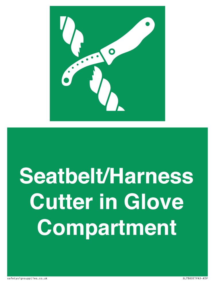 Sign Text: Seatbelt/Harness Cutter in Glove Compartment