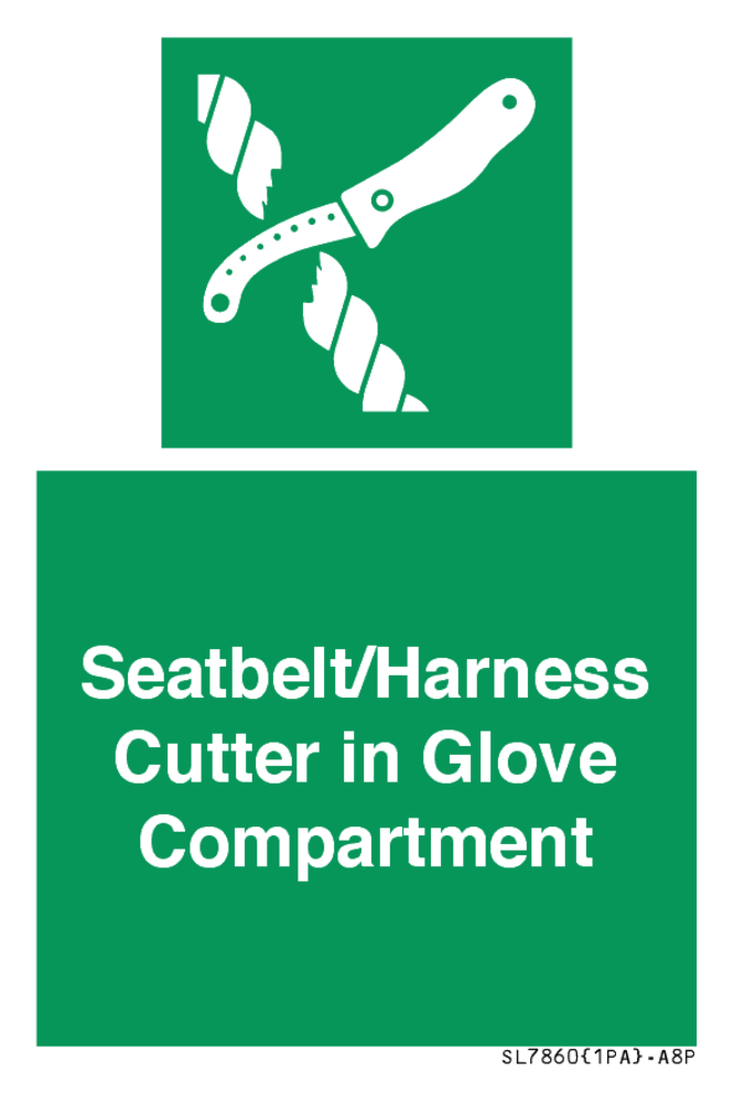 Sign Text: Seatbelt/Harness Cutter in Glove Compartment