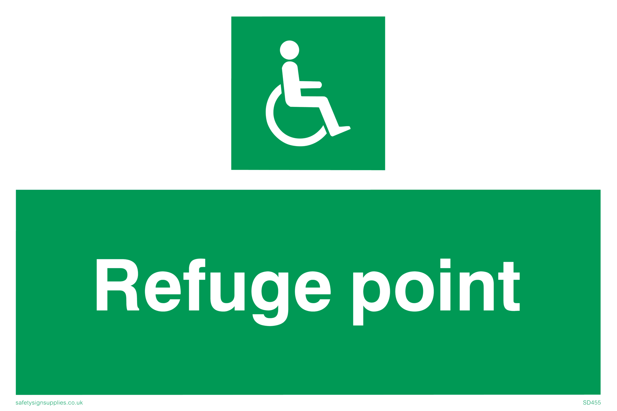 Assembly point signs indicate the location and purpose of fire or emergency assembly and refuge points. Refuge signs indicate the presence of a refuge point. Disability signs are used to indicate access or special provisions for disabled people. BS5499 signs are designed to meet the applicable British Standard 5499, normally relating to fire exit signs. This sign is large.