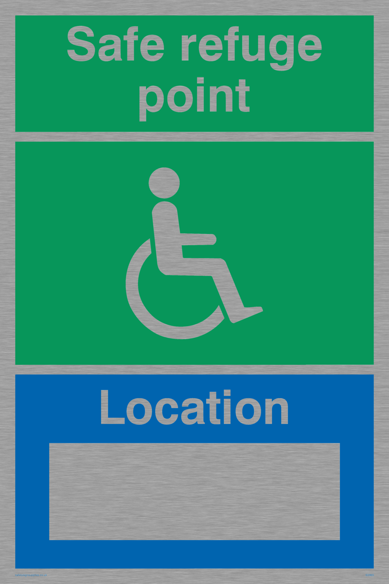 Assembly point signs indicate the location and purpose of fire or emergency assembly and refuge points. Disability signs are used to indicate access or special provisions for disabled people. Refuge signs indicate the presence of a refuge point. This sign is medium sized. This sign is approximately equivalent to A4 paper size.