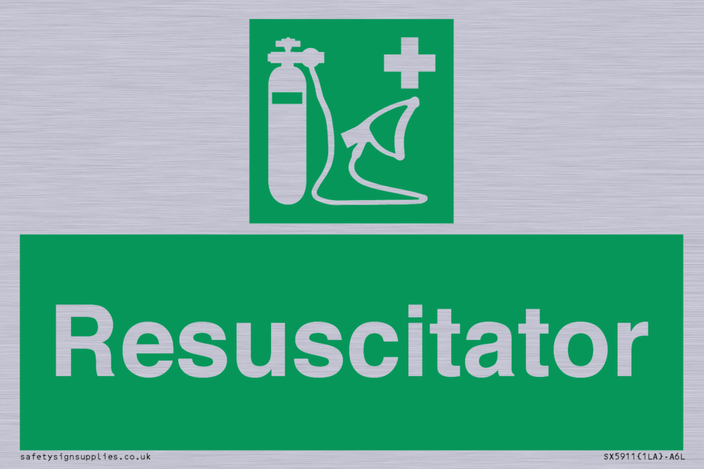 Sign Text: Resuscitator Dimensions: 150x100mm Material: Aluminium composite 3mm brushed silver Orientation: Landscape Text Colour: White Background Colour: Green More...