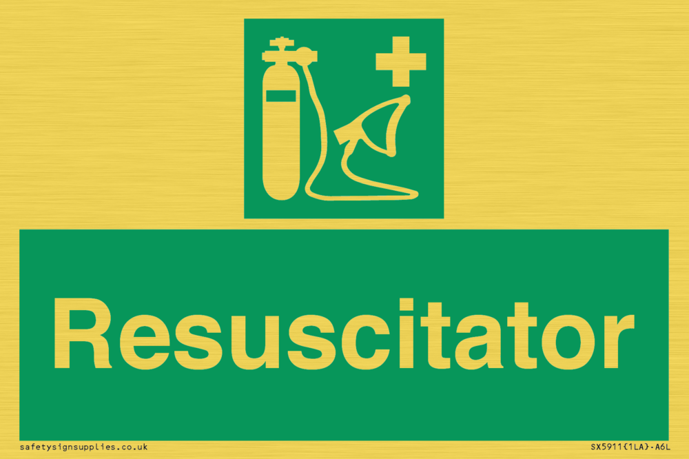 Sign Text: Resuscitator Dimensions: 150x100mm Material: Plastic Semi-rigid Gold Orientation: Landscape Text Colour: White Background Colour: Green More...
