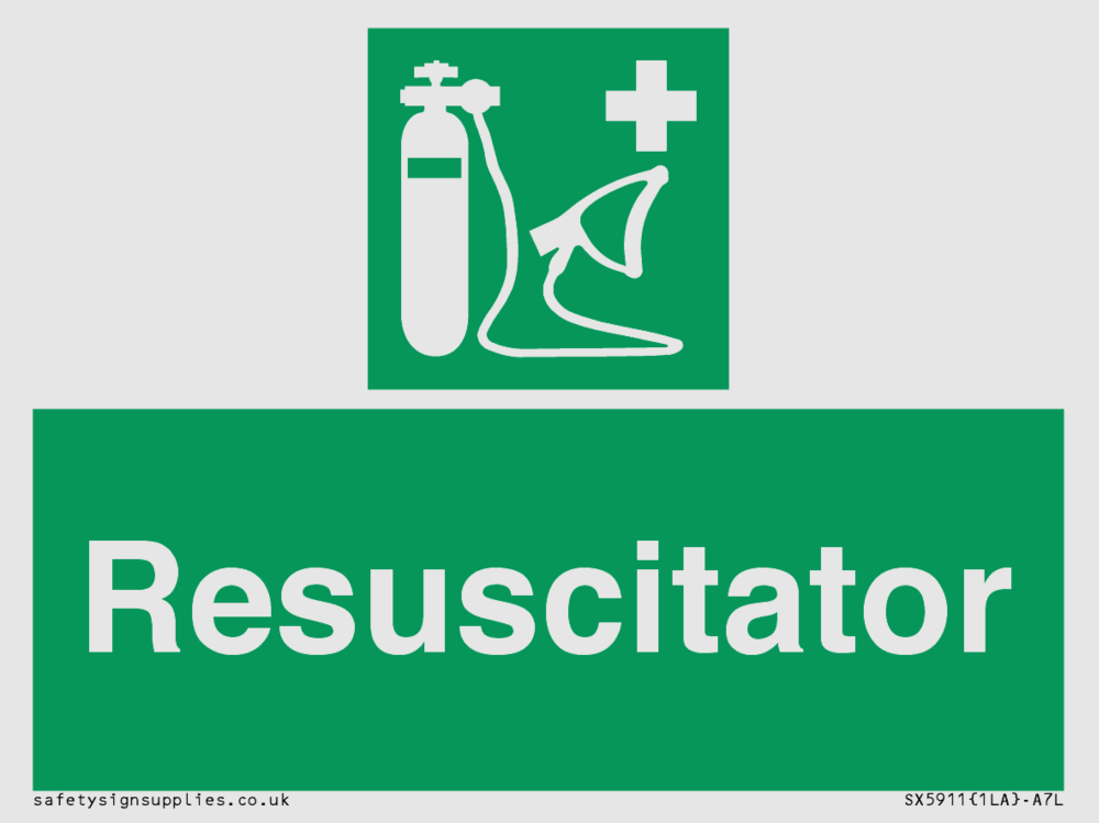 Sign Text: Resuscitator Dimensions: 100x75mm Material: White Reflective Aluminium Composite 3mm Orientation: Landscape Text Colour: White Background Colour: Green More...