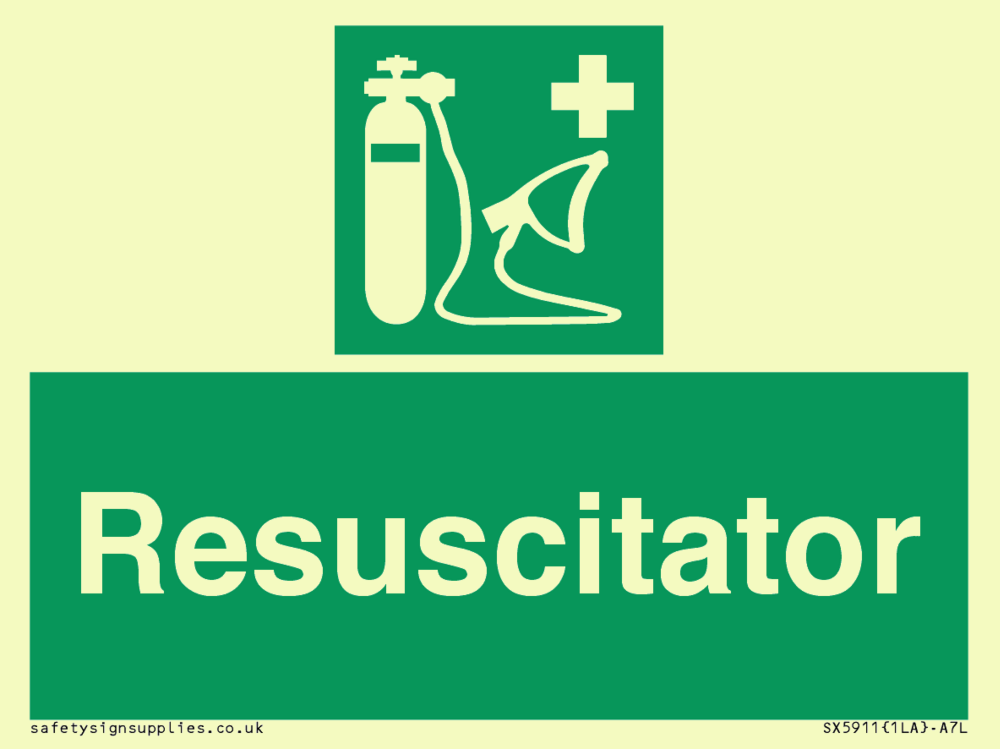 Sign Text: Resuscitator Dimensions: 100x75mm Material: Plastic Semi-rigid Photoluminescent Orientation: Landscape Text Colour: White Background Colour: Green More...