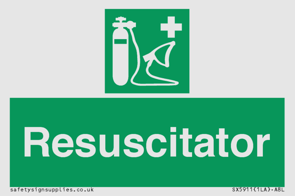 Sign Text: Resuscitator Dimensions: 75x50mm Material: White Reflective Aluminium Composite 3mm Orientation: Landscape Text Colour: White Background Colour: Green More...