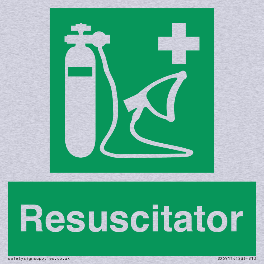 Sign Text: Resuscitator Dimensions: 100x100mm Material: Satin Silver Aluminium Orientation: Square Text Colour: White Background Colour: Green More...
