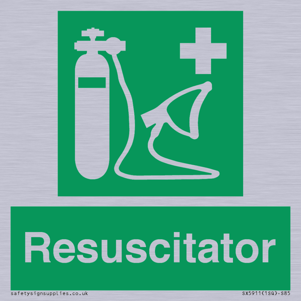 Sign Text: Resuscitator Dimensions: 85x85mm Material: Grained Silver Aluminium Orientation: Square Text Colour: White Background Colour: Green More...