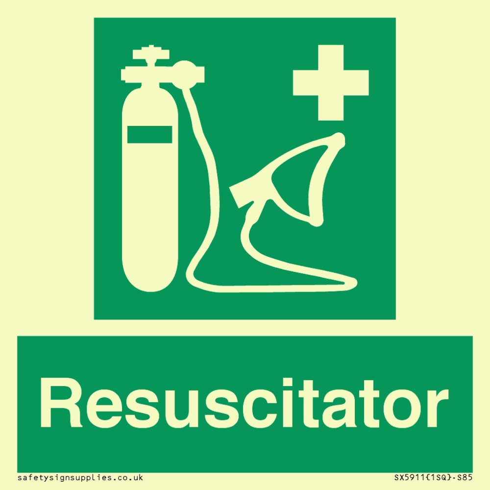 Sign Text: Resuscitator Dimensions: 85x85mm Material: Plastic Semi-rigid Photoluminescent Orientation: Square Text Colour: White Background Colour: Green More...