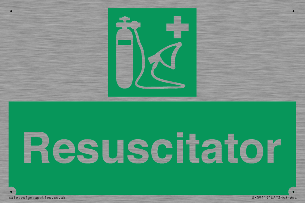 Sign Text: Resuscitator Dimensions: 150x100mm Material: Stainless Steel Orientation: Landscape Text Colour: White Background Colour: Green More...