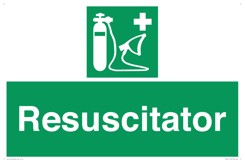 Sign Text: Resuscitator Dimensions: 600x400mm Material: Plastic Semi-rigid 1mm Orientation: Landscape Text Colour: White Background Colour: Green More...
