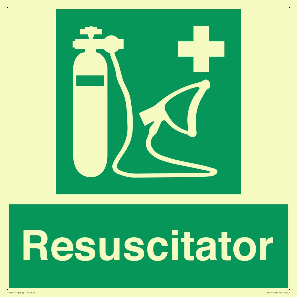 Sign Text: Resuscitator Dimensions: 400x400mm Material: Plastic Semi-rigid Photoluminescent Orientation: Square Text Colour: White Background Colour: Green More...