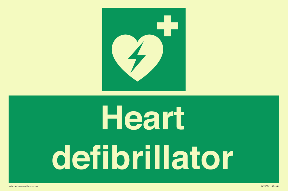 Green background, with white text and heart defibrillator symbol - white cross and heart with lighting bolt in green.