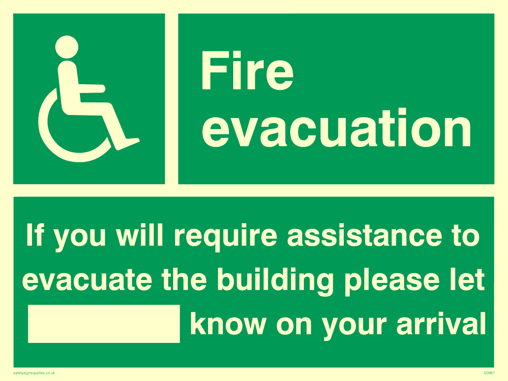 Sign Text: Fire evacuation - if you will require assistance to evacuate the building please let (blank space) know on your arrival