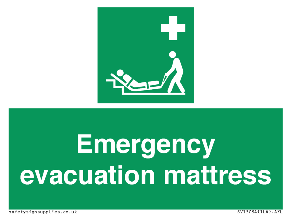 Image content : Human figure lying on a mattress, human figure pulling the mattress from stairs over floor, first aid cross