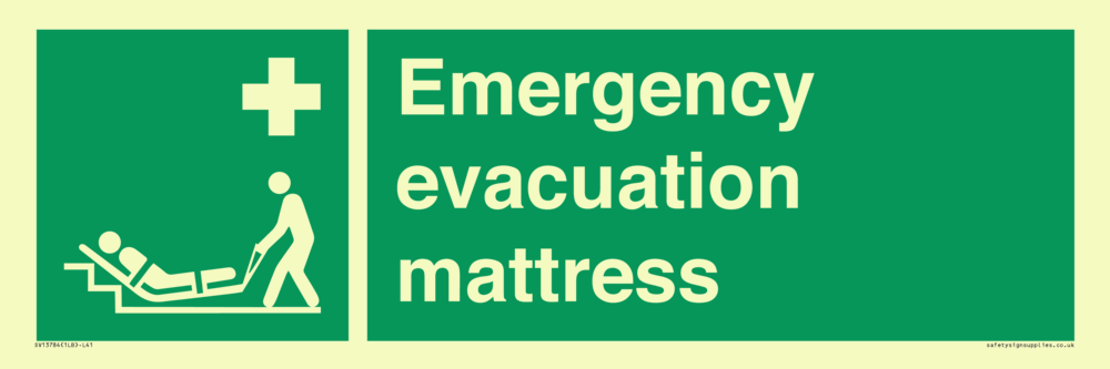 Image content : Human figure lying on a mattress, human figure pulling the mattress from stairs over floor, first aid cross