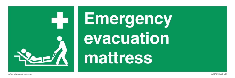 Image content : Human figure lying on a mattress, human figure pulling the mattress from stairs over floor, first aid cross